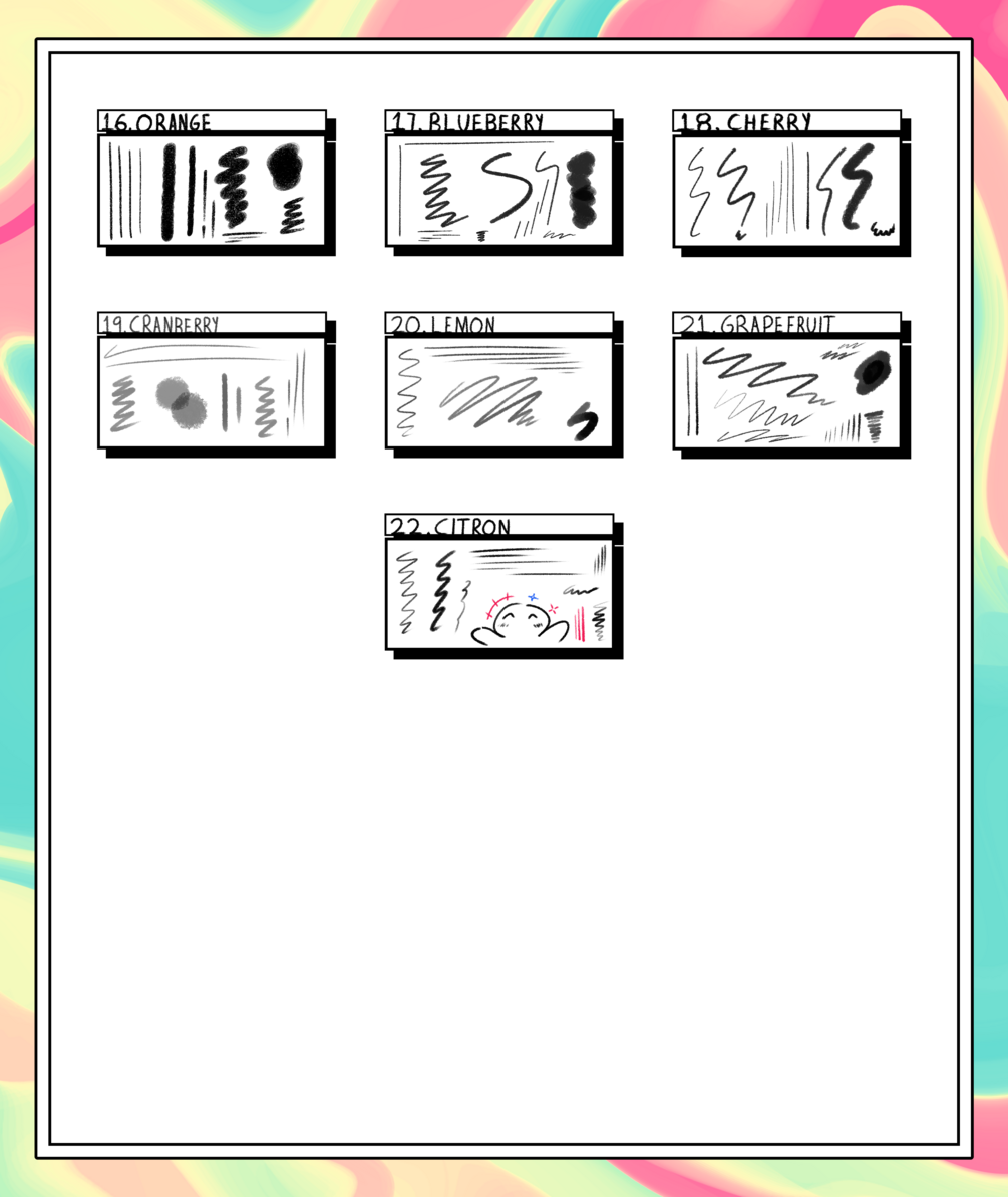 Thumbnail made with 09.Apricot, 13.Banana, 14.Raspberry, 15.Raspberry 2, 16.Orange, 21.Grapefruit, 22.Citron.